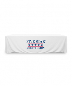 8 ft. Premium PolyKnit throw table cover with one color logo. Fits a 96 inch wide x 30 inch deep table. All corners are rounded meaning they will not gather and lay on the floor. Floor length on 4 sides. This cloth requires no ironing, is EasyCare machine washable and dryer safe.
