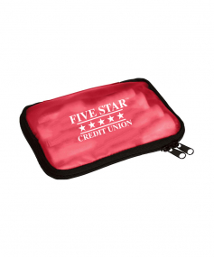 Vinyl case with zipper includes a 12 hour safety light stick, 10 latex-free bandages, 5 snip bandages, two 2" x 3" adhesive pads, 2 knuckle bandages, 5 antiseptic towelettes, 5 first aid cream packets, 2 non-adhesive pads, 1 gauze roll, 1 roll of adhesive tape, and 1 first aid guide.