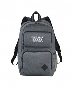 Zippered main compartment with padded laptop sleeve holds up to a 15.6 inch computer, dedicated iPad/tablet pocket with room for all your other business essentials. Two front zippered pockets are large enough for power banks, cables, pens and notecards. The two front pockets also offer flexible decorating locations. Side water bottle pocket. Complies with Prop 65. 17.5" H x 12" W x 6.5" L