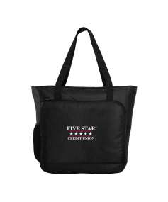 This tote is made of 600D polyester canvas, 360D polyester twisted twill canvas. It features a zippered large main compartment, and has a front zippered pocket with an interior organization panel. It also has over-the-shoulder length web handles. The laptop sleeve dimensions are 13"h x 16"w, and fits most 15" laptops. 16" H x 15.5" W x 6.5" D