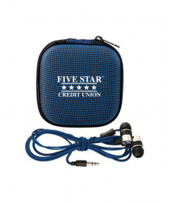 Molded textured case with zipper closure. Includes matching Braided Ear buds. Complies with Prop 65. 3.25" L x 3.25" H x 1.25" W
